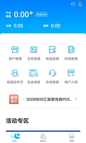 3、进入软件后,在首页可以看到商务管理、交易管理、收益管理、终端管理灯;