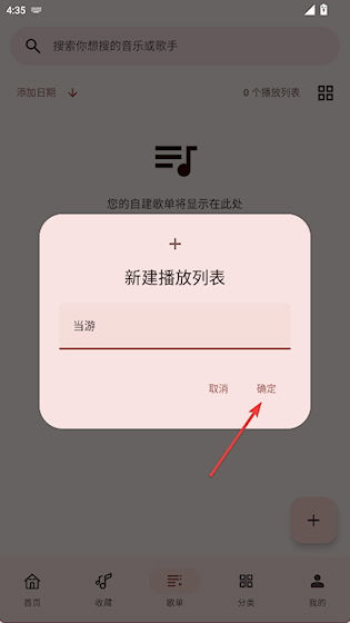 2、输入播放列表名称,点击确定