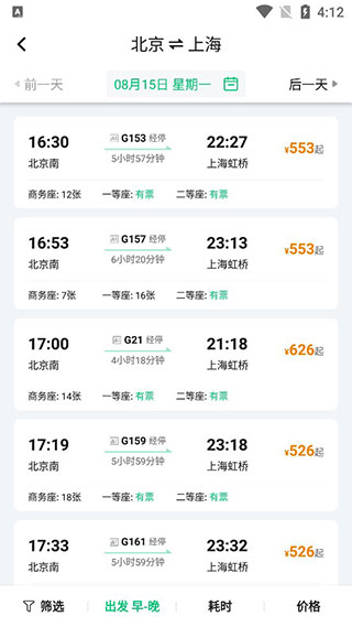 3、选定工具后输入目的地与现居地查询,结合时间安排挑选合适班次;
