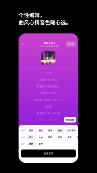 丰富的自定义功能,可以随心选择曲风、心情和音色,打造专属个性化音乐。