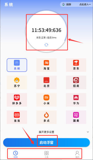 2、主界面展示精准时间,点击启动浮窗,开启时间悬浮显示功能;