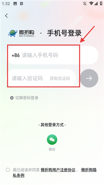 输入手机号和验证码。