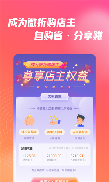 第六步:完成安装后,在手机桌面找到微折购APP并打开,选择微信授权登录方式进入。登录时需输入邀请人的邀请码,接着绑定好个人手机号码,即可进入店铺界面。此时需要联系您的推荐人,由其直接为您授权店主身份,开通专属店铺(店铺头像可设置为您自己的),开通后店铺内所有产品均可享受店主专属价格。