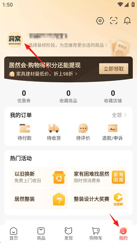 1、打开洞窝家居 APP,进入主界面后点击我的,再点击页面中的个人头像;