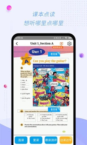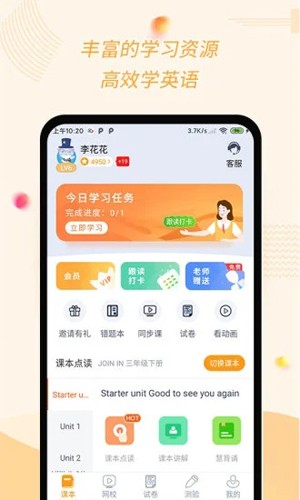 【课本听说读】:覆盖大部分课本教材,支持课本点读、连读、复读、跟读,查看翻译,支持离线下载课本哦,让您轻松搞定小学英语;