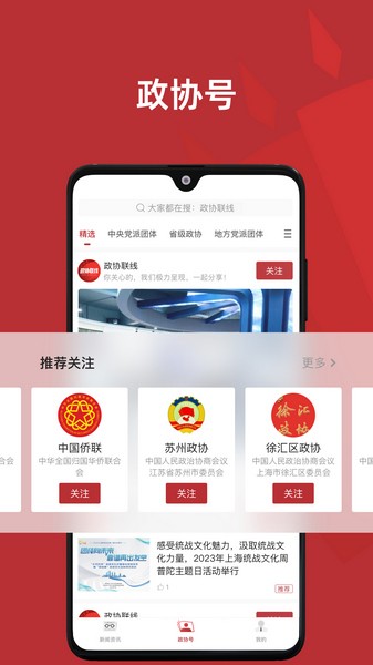4、【政协号】各地区政协、政协相关机构、政协各专委会、民主党派、社会团体、明星委员将陆续入驻,发布相关信息,你可关注感兴趣的政协号,与其交流互动,释问答疑;