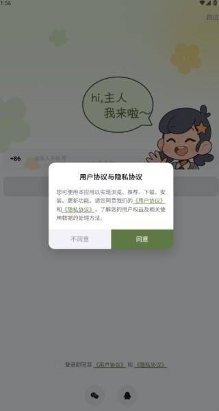 1、打开安装好的智记妞妞,跳转登录界面后,弹出用户协议和隐私协议,点击同意并继续;