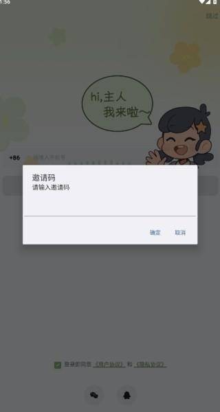 2、同意协议后,弹出邀请码输入框,有邀请码可填写,无则点击取消;