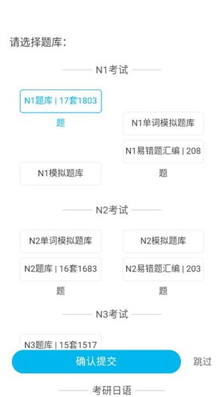 3、题库类型丰富,含N1至N3、考研日语等,选完点击提交。