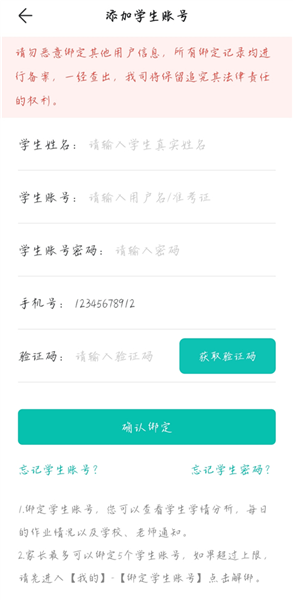 5、使用学生账号密码进行绑定时,输入学生姓名、账号密码、获取验证码后,点击【确定绑定】就行。