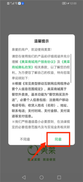 1、启动美菜应用,先在温馨提示页阅读内容后点击同意按钮。