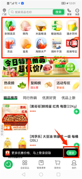 3、在主界面按分类选购商品,点击右下角登录获取专属优惠。