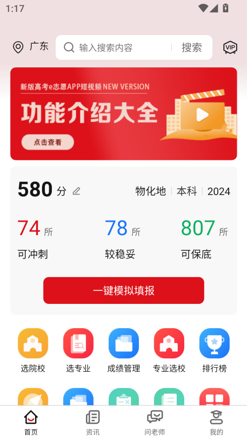 1、在本站下载高考 e 志愿官方正版,首页功能清晰,有选院校、选专业等板块,助你了解高考志愿信息。