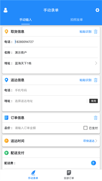 1、手动录单/拍照发单,一键发往团队自动调度;