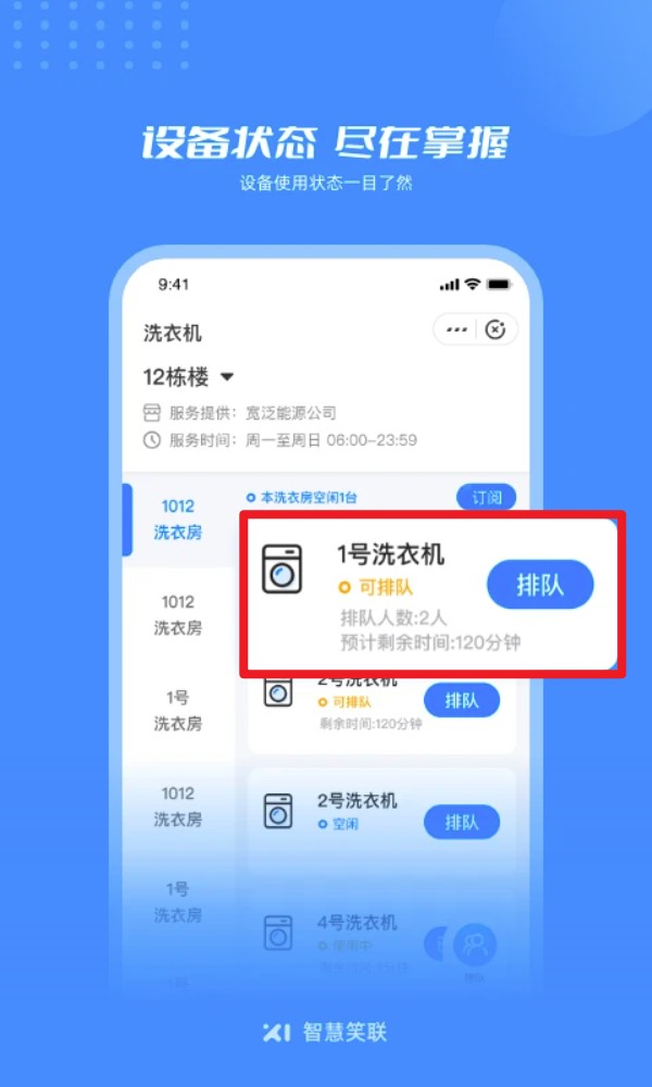 2. 点击洗衣机进入设备详情页面,可以查看设备状态、队列人数以及剩余时间,一目了然。