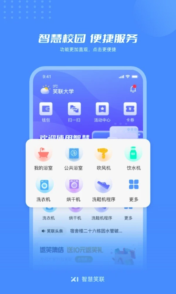 智慧笑联app是一款面向高等院校设计的智慧校园服务软件,专注于热水洗浴、饮用水供应、空调使用等日常生活场景,借助智能物联网、云端控制技术,为学校师生提供智能便捷的生活服务体验。它融合了设备状态管理、使用数据统计、重要公告通知等多种功能,通过集中化的操作界面,简化了传统校园生活中各类设施的使用流程,让获取热水、调节室温、查看消费记录等日常事务能够随时随地轻松完成。