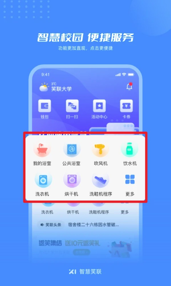 2、 场景覆盖:包含校园热水、洗衣、干衣、洗鞋、直饮水、电吹风、空调等多项生活服务场景。