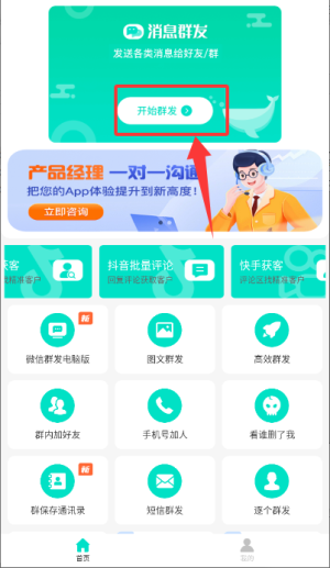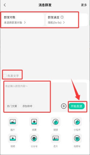 2、在主界面找到“开始群发”按钮,点击后进入消息群发设置页面。