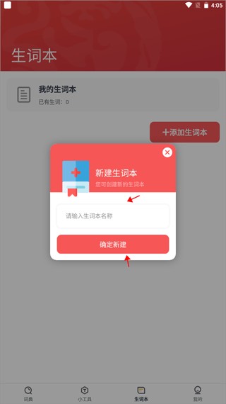 2、为新建生词本取简洁明了的名称,点击“确定新建”完成创建;