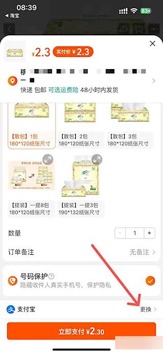 2、在支付宝支付方式右侧点击【更换】。