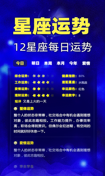 4、每天运势:提供每天运势、每周运势、每月运势、每年运势。