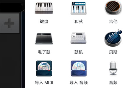 3、合成后,轻触左侧“+”按钮选择乐器,进入演奏页面点击红色按钮录音并开始演奏。