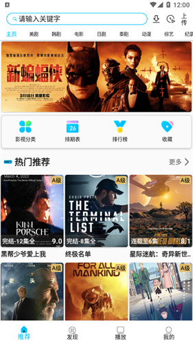 美剧巴士2025最新版是一款为看美剧的人群打造的追剧软件,可搜索到各种美剧自由观看。其题材可谓相当丰富,自带的中文字幕让你无需担心看不懂的可能性。能直接在搜索栏中输入关键字搜索想要观看的美剧,也可以通过分类进行浏览。软独特的推荐算法会向观众推荐热门的美剧,让观众能品鉴深受好评的优质影视剧。每部作品都有专属评论区,可与其他观众一起讨论和吐槽剧情。