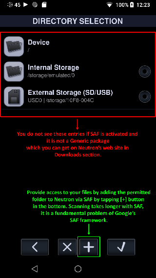 2、如果您在Android11+上使用2、19+版本,那么您将看不到Device或SD,只能访问Neutron的内部文件系统(沙盒),您可以通过在网络设置中激活内部FTP服务器来访问它,点击底部的[+]以添加允许Neutron访问的文件夹