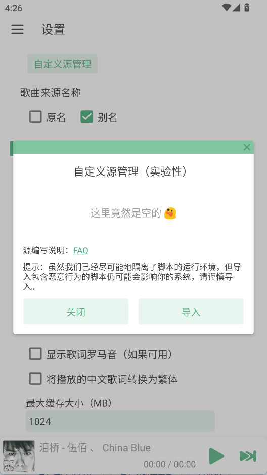 4、还可以在设置里点击自定义源管理,导入其他音源