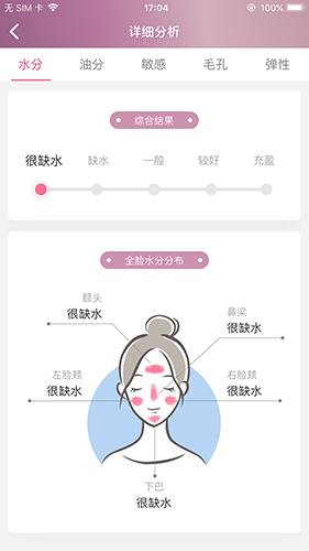 拿额头皮肤的水份状态举例好了,“大眼睛”除了告诉你本身的水分状态,还能呈现从“充盈”到“严重缺水”等5种不同程度的皮肤状态对比,让你更清楚地了解皮肤。