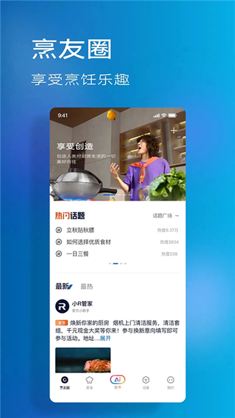 根据您的口味和饮食习惯,结合应季食材,智能推荐个性化美食菜谱;整合智能健康设备与体检数据,为您定制专属营养搭配和健康饮食计划;烹友圈互动,让您紧跟烹饪界的新趋势,每天都有新的烹饪灵感。