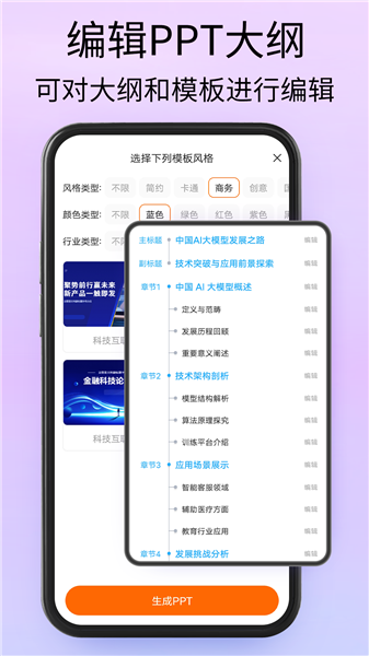 强大的AI会对用户需要的PPT大纲来自动生成,智能生成大纲,轻松解放用户的双手。
