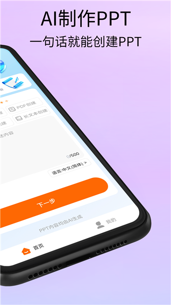 1.在首页中在创建PPT页面中输入需要创作的内容点击下一步即可