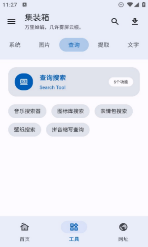 集装箱是一款功能丰富的安卓综合工具箱应用。它将资源嗅探、音乐搜索、视频解析等众多网络工具与日常所需的实用小工具融合在一起,既能处理各种任务,也提供了便捷的影音娱乐入口。该应用的显著特点是轻量化,安装包体积仅为7M左右,却集成了几十种即开即用的功能。整个软件设计简洁,在使用过程中不会出现广告弹窗等干扰,保持了干净、高效的使用体验。
