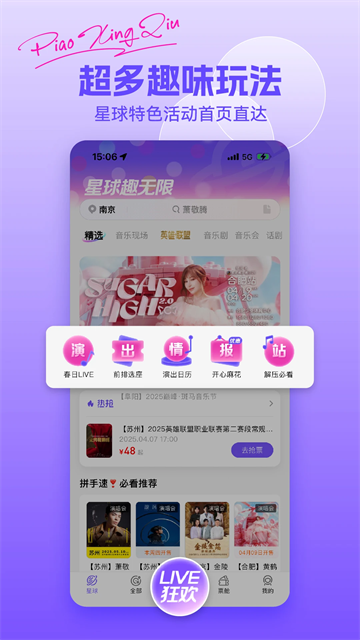 2、进入首页,选择热抢、星球推荐、演唱会等