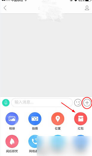 3、进入聊天界面后,点击“ + ”按钮,会弹出多个选项,点击其中的“红包”选项,即可进入发红包界面。