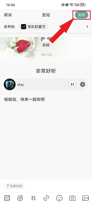 4、编辑帖子内容:开始编辑帖子内容,利用下方工具辅助操作,如添加图片、表情、音乐等。