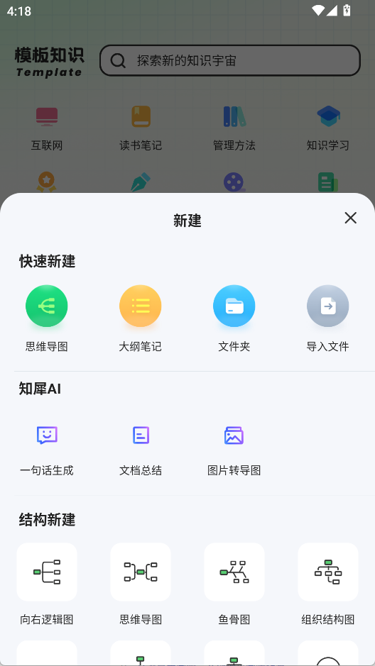 3、点击+,创建思维导图、大纲笔记等内容