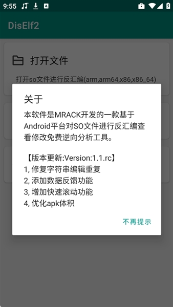 DisElf2反编译是一个强大的手机端SO文件逆向工具,支持无root运行,免去额外安装脱壳工具的麻烦。可以一键去除360加固,精准解析SO文件,并将机器码转换为汇编语言。内置伪C转换等高级功能,使得修改代码、分析核心逻辑变得更加简单。无论是进行功能解锁、漏洞挖掘,还是底层原理分析,都能提供高效便捷的支持。无需root权限就可以使用,可以对一些apk文件进行反编译,十分好用,为大家提供更多的帮助。