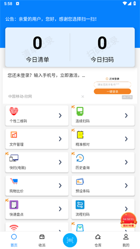 2、首页页面,可以查看今日清单、今日扫码数量,还包含个性二维码、联系扫码、文件管理、精准核对、购物比价、预设条码、快速盘点、流程扫码等功能。