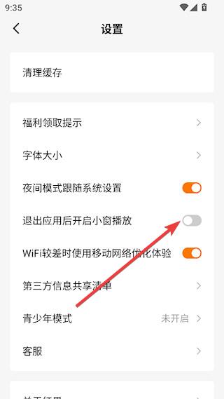 3、找到【退出应用后开启小窗播放】,点击打开即可