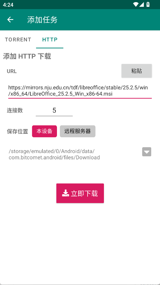 2、在上方可以选择http或torrent任务,http模式下粘贴URL即可开始下载