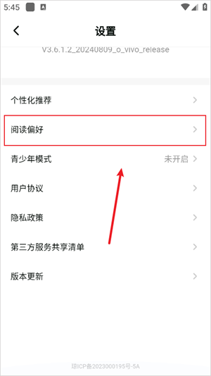 3、进入设置后点击阅读偏好。