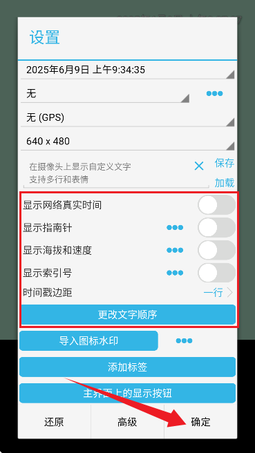 5、可自主选择开启网络时间、指南针、海拔、速度及时间戳等水印相关信息;