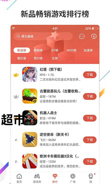 4、点开排行,有新品榜、畅销榜、BT榜、MOD榜、预约榜等多种游戏排行榜供玩家选择。