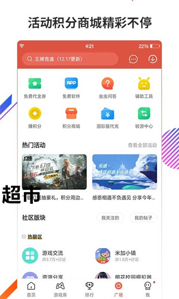 5、点开广场,有平台推荐的热门活动,还有游戏社区,玩家可以社区相互交流。