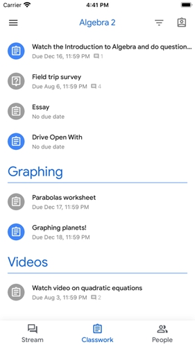 学生可以在作业页面查看自己的所有作业,所有课程资料(如文档、照片和视频)都会自动放入专属 Google 云端硬盘文件夹中。