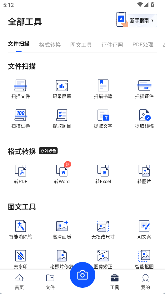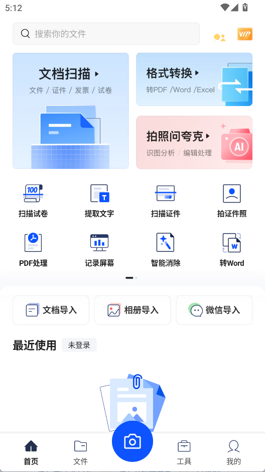 1、打开夸克扫描王app,在主页有多种常用功能,如格式转换、文档扫描提取文字等