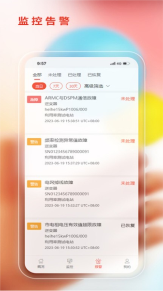 4.监测到电站的异常情况时会提供报警提醒服务,用户可查看报警信息进行了解。