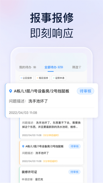 对所有业主提供的最新报事报修信息提供,实时查看最新的工作待办任务;
